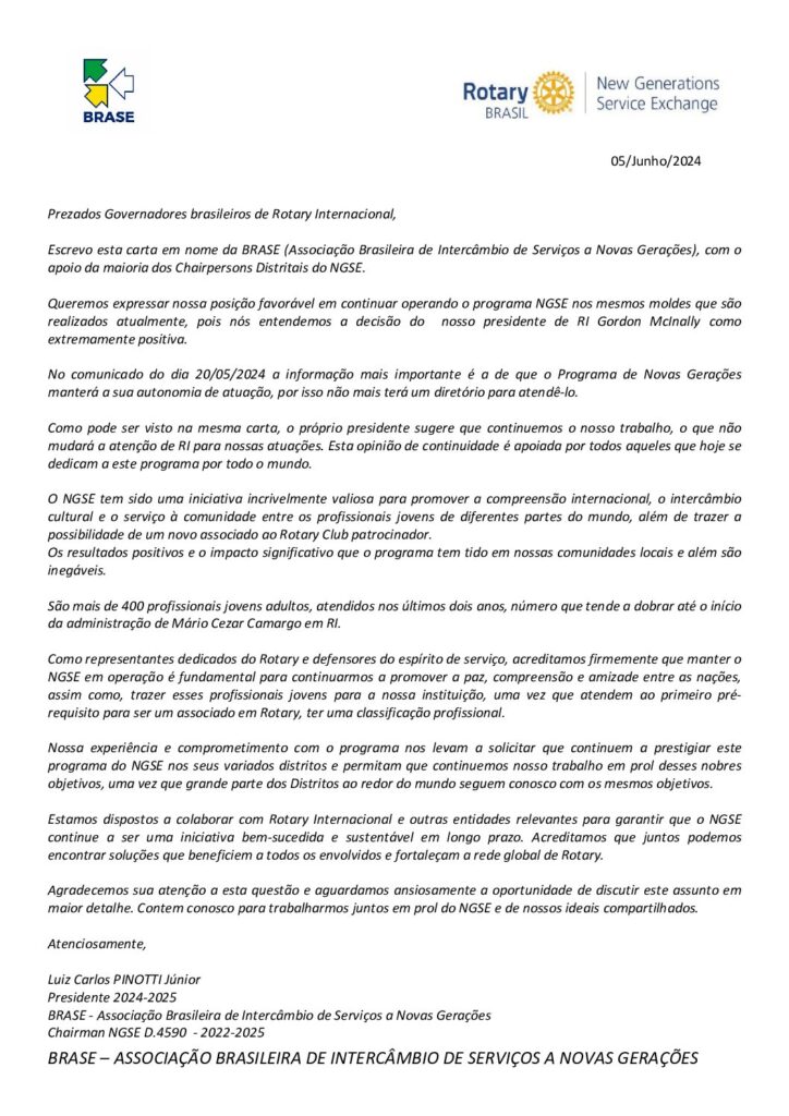 Recentemente, o Rotary Internacional decidiu descontinuar o intercâmbio NGSE (New Generations Service Exchange) de seus programas oficiais. Esta decisão, aparentemente motivada por considerações econômicas, surpreendeu muitos, pois o programa gerava poucas despesas. No entanto, essa mudança não diminuiu o entusiasmo e o comprometimento dos países que já adotaram o NGSE, como o Brasil.
